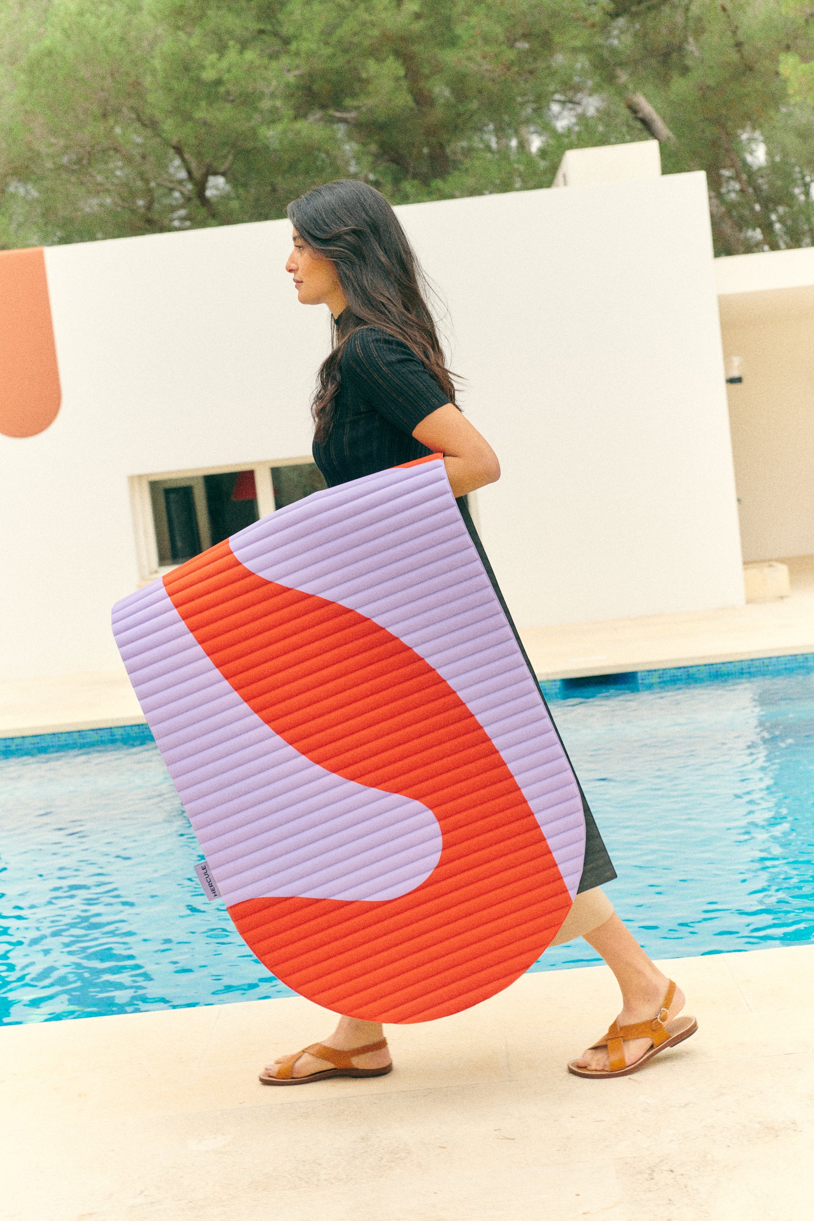 Bundle essentiel Hercule Studio imprimé Axel rouge orangé avec tapis Archy graphique, pad Galé 3-en-1 et spray nettoyant pour tapis de sport, set pilates design et responsable fabriqué en France, packshot produits