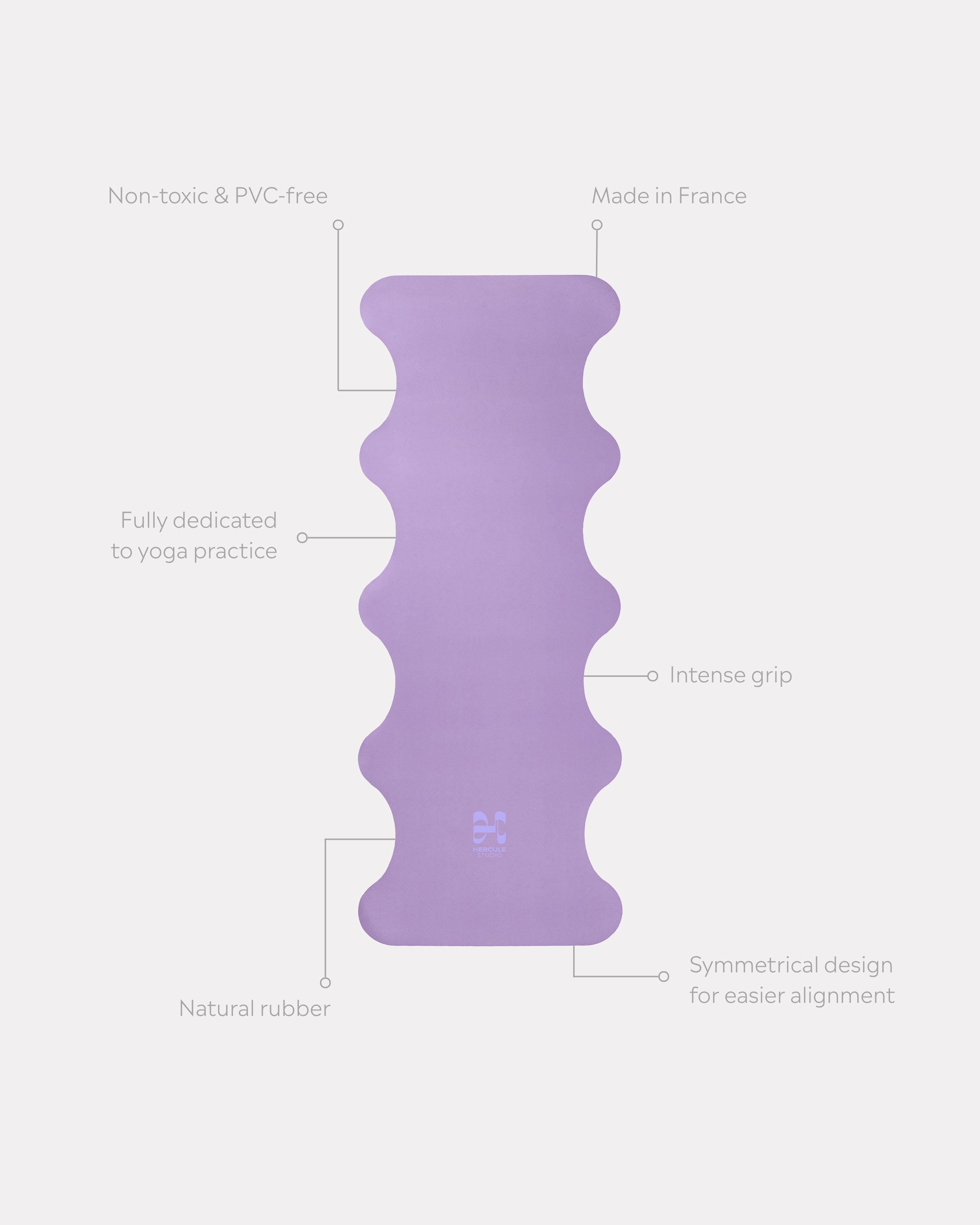 Tapis de sol pour le yoga de la marque hercule studio modèle mar couleur lavande packshot déplié avec éléments de réassurance
