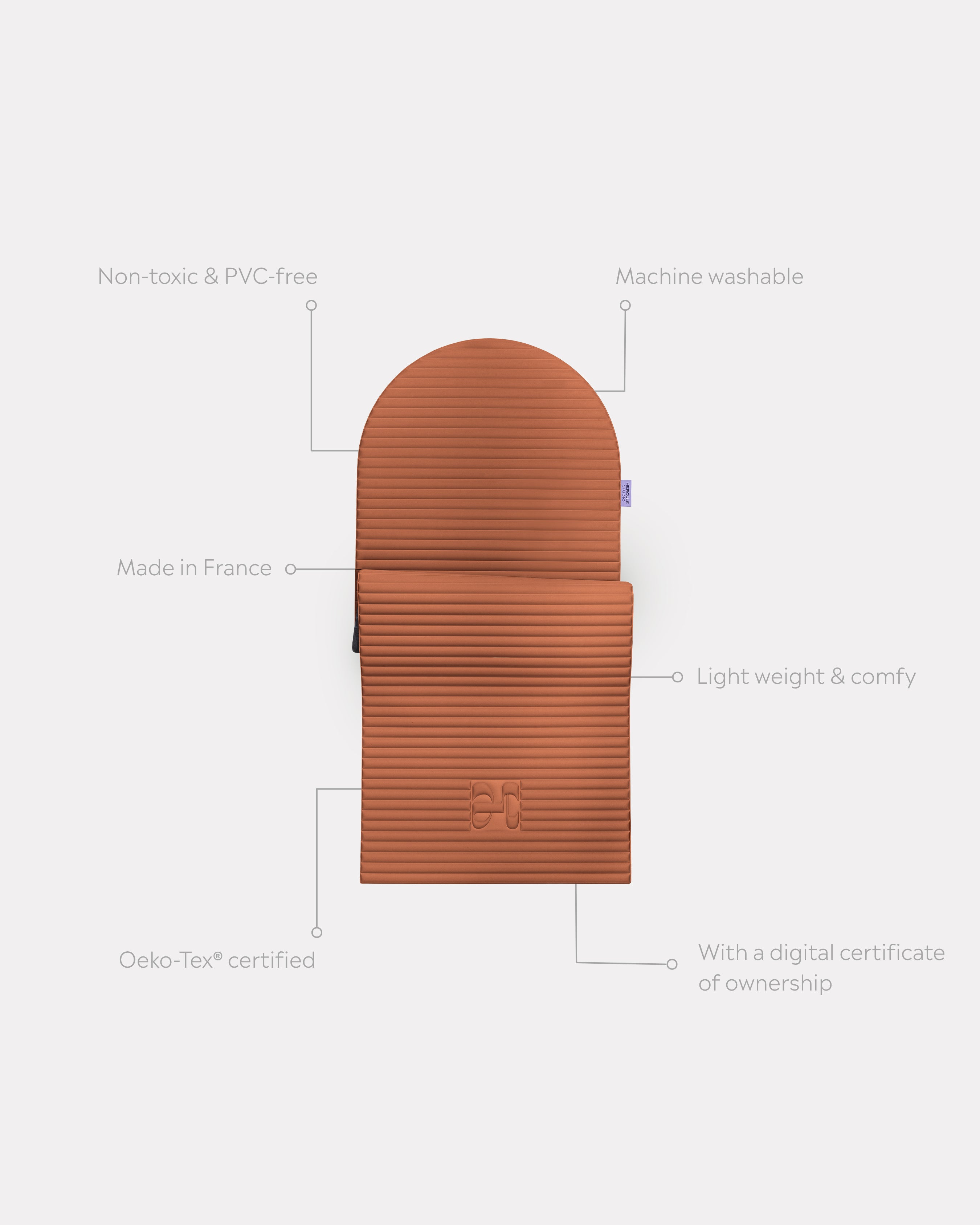 Sa surface au relief bombé apporte confort, sensorialité et son épaisseur de 0,8 cm garantit un maintien ferme et accueillant à la fois. Sa couleur Terre cuite s’inspire des tonalités rouge Estérel, évocatrices du charme de la French Riviera, que l’on retrouve dans les roches rouges de Théoule-sur-Mer et sur l'iconique Palais Bulles de Pierre Cardin.